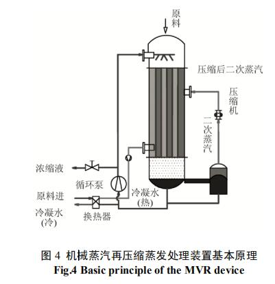 作为20 世纪90 年代末开发出来的新型高效节能蒸发技术,机械蒸汽再压缩蒸发(mvr)又可称为热泵技术,其基本原理是将蒸发器中原本需要用冷却水冷凝的二次蒸汽,经压缩风机提高其压力和饱和温度,增加其热焓,然后再送入蒸发器加热室作为热源加热料液,其基本原理如图 4 所示。大多数 mvr 装置生产能力约 500 m³/d,同传统 med 相比,二次蒸汽的潜热得到了充分利用,节能 50%。