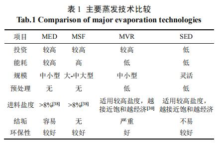 med、msf、mvr、sed 几种主要蒸发法在节能性、环保性、经济性及规模和预处理要求方面的比较见表 1。相比 msf、med 和 mvr 等常规的含盐废水处理方法,sed 具有装置操作灵活、预处理简单、不易结垢及环保性良好等优点,适于处理较高盐度含盐废水,且脱盐效率高,盐分甚至可以完全结晶,经济性好、节能效果显著,能克服常规处理方法的缺点,具有较大的研究价值。但是,含盐废水的复杂性使得单一技术难以实现对含盐废水的高效节能处理,因此,技术集成优化是火电厂含盐废水处理技术发展的重要趋势。