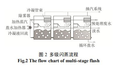 由于闪蒸室中的压力低于盐水在该温度下所对应的饱和蒸汽压力,盐水迅速沸腾,直到温度降到沸点。其中,一部分盐水汽化,生成的蒸汽通过除雾器去除溶解的盐类物质后,在顶部的进水冷凝管束表面冷凝,然后生成淡水被收集。未汽化的盐水则流入下一级压力较低的闪蒸室继续上述过程。msf系统必须有一个真空装置来去除不可冷凝气体,并维持所需的负压。