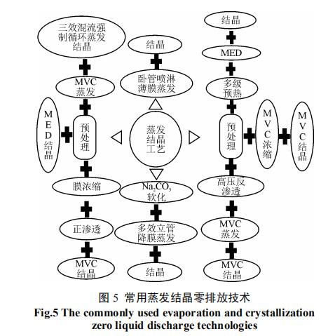 图 5给出了 8 个利用蒸发结晶技术实现零排放的较常用工艺,即:预处理+mvc 浓缩+mvc 结晶、预处理+多级预热+多效蒸发(med)+结晶、预处理+高压反渗透+mvc 蒸发+mvc 结晶、预处理+膜浓缩+正渗透+机械蒸发(mvc)结晶、预处理+mvc 蒸发+三效混流强制循环蒸发结晶、预处理+med 结晶、na2co3 软化+多效立管降膜蒸发+结晶、卧管喷淋薄膜蒸发+结晶。