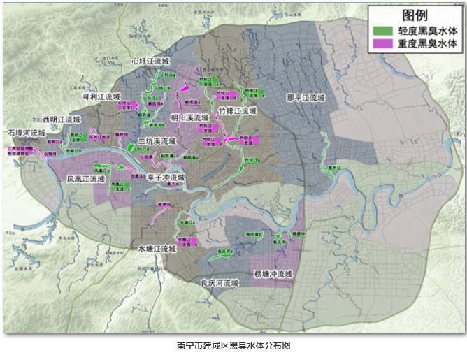 根据2015年普查结果,南宁建成区有13条内河,共38个河段属于黑臭水体,黑臭水体总长度99.4公里、总水域面积1.41平方公里。2018年南宁转变治理思路,从“末端治理”和“只治水里”转向“全过程治理”和“水陆同治”,但在实施过程中仍然存在三方面问题:一是治理方式过于依赖灰色设施,尤其是调蓄池设计规模较大;二是污水收集处理效能低,污水厂进厂bod浓度不高,排水系统建设“重厂轻网”;三是排水管网历史欠账多,存在污水管道缺失、污水管网淤堵破损、雨污水管道错混接等突出问题。
