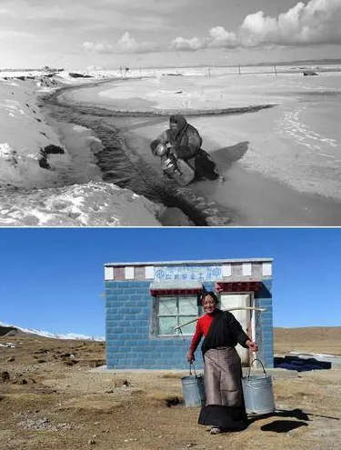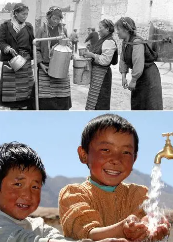 这张拼版照片的上图:西藏江孜古镇居民在取水。西藏江孜古镇千百年来靠人背畜驮饮水,上个世纪80年代,江孜古镇建起一座小型自来水厂,解决了人畜饮水问题;下图:西藏拉萨达孜县(现达孜区)朗热村的儿童在用自来水洗脸(资料照片)。新华社发