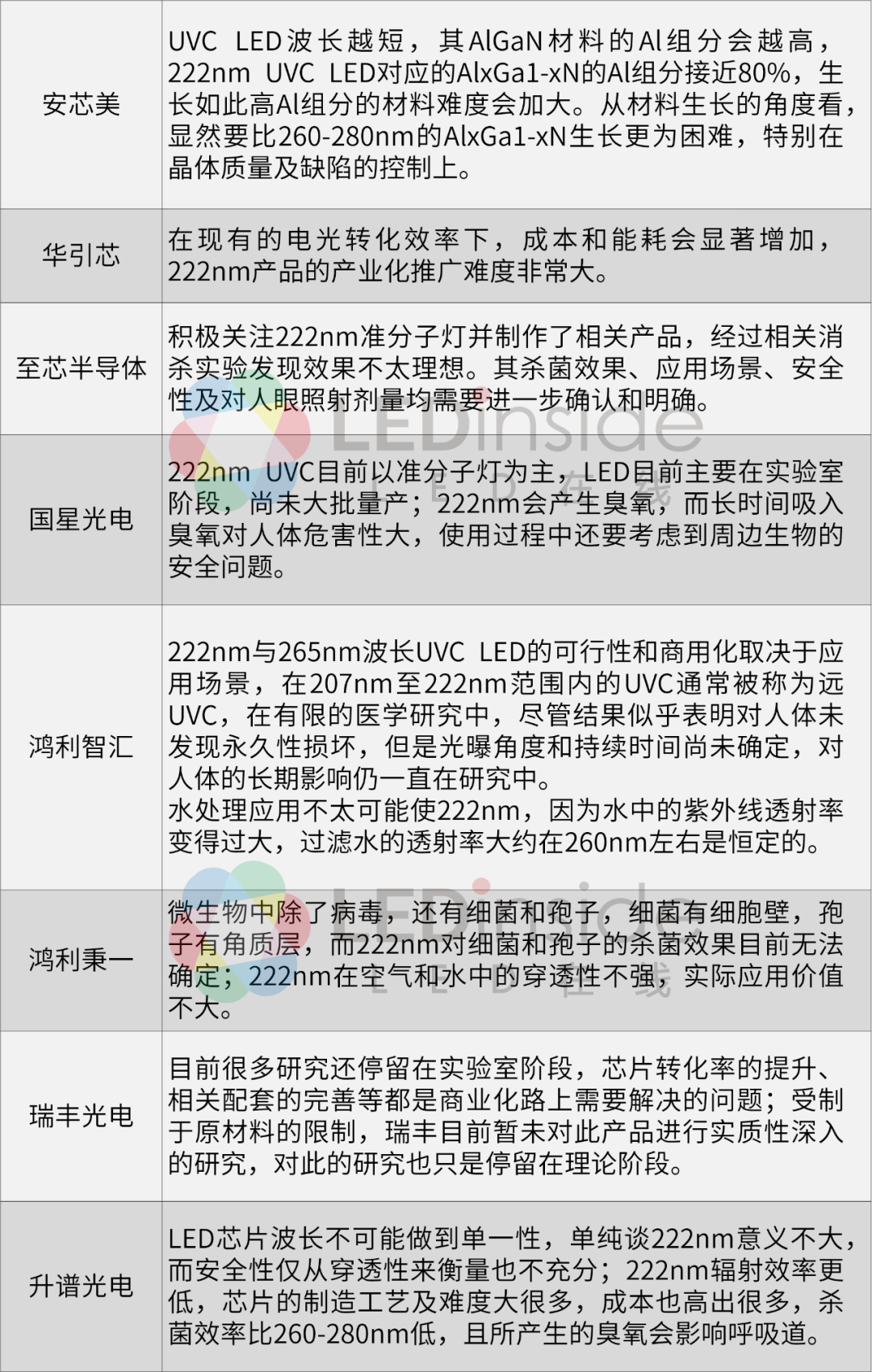 不止艾迈斯半导体与欧司朗,国内不少厂商所见略同。总的来说,222nm波段利弊兼具,目前还处于研究探索阶段,安全性、可行性方面也需要更多的验证。222nm目前主要以准分子灯为主,222nm uvc led商用化则言之尚早。