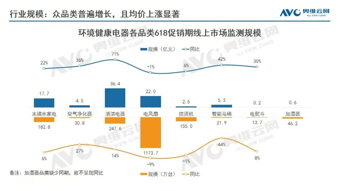 根据奥维云网监测数据,相比2020年,2021年618大促(5月24日~6月20日)期间,环境健康类电器众品类普遍出现明显增长。其中,末端水家电线上市场达到182.8万台,同比增长6%;市场规模达到17.7亿元,较去年同比上升22%。