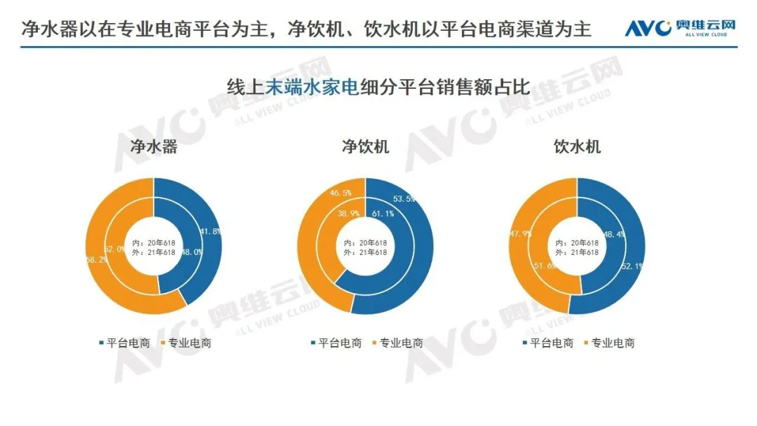 从销售平台来看,净饮机、饮水机以平台电商(天猫)居多,而净水器则在京东、国美、苏宁(含猫宁店)等专业电商平台更占优势。
