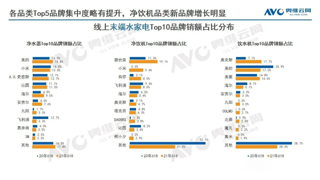另外,在净饮机品类中,出现了新品牌明显增长的现象。综合以上现象,末端水家电市场在大品牌步入稳步增长的同时,仍然保留着很大的发展空间。
