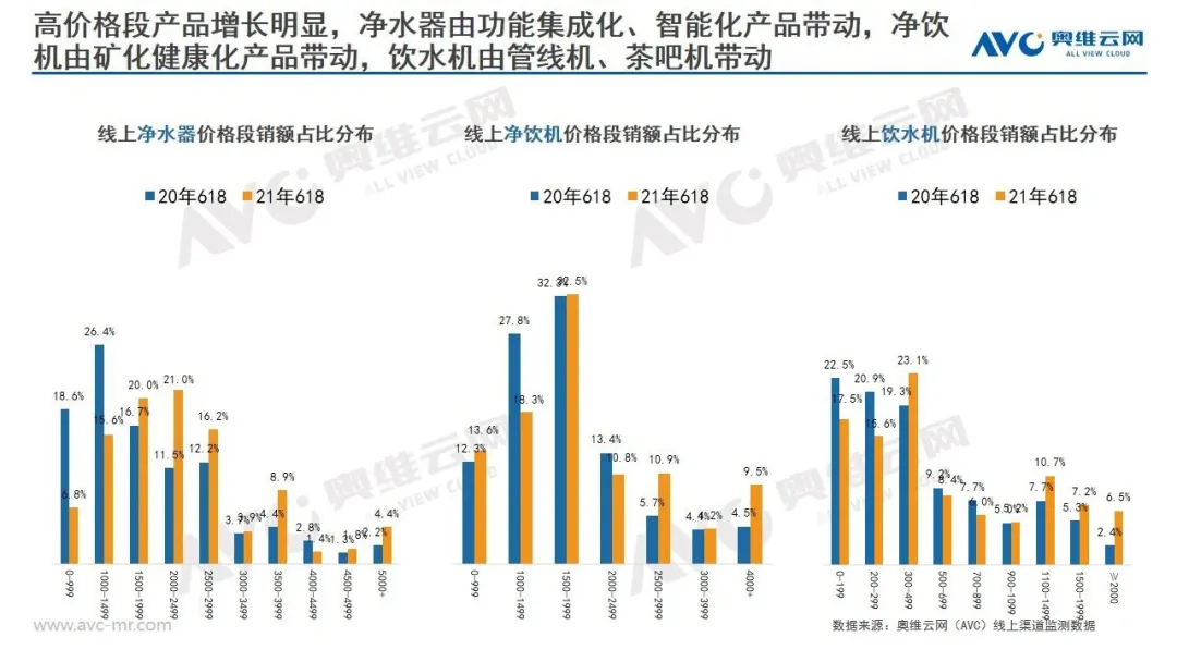 2、线上市场净水器均价有所提升,高价位段产品增长明显。