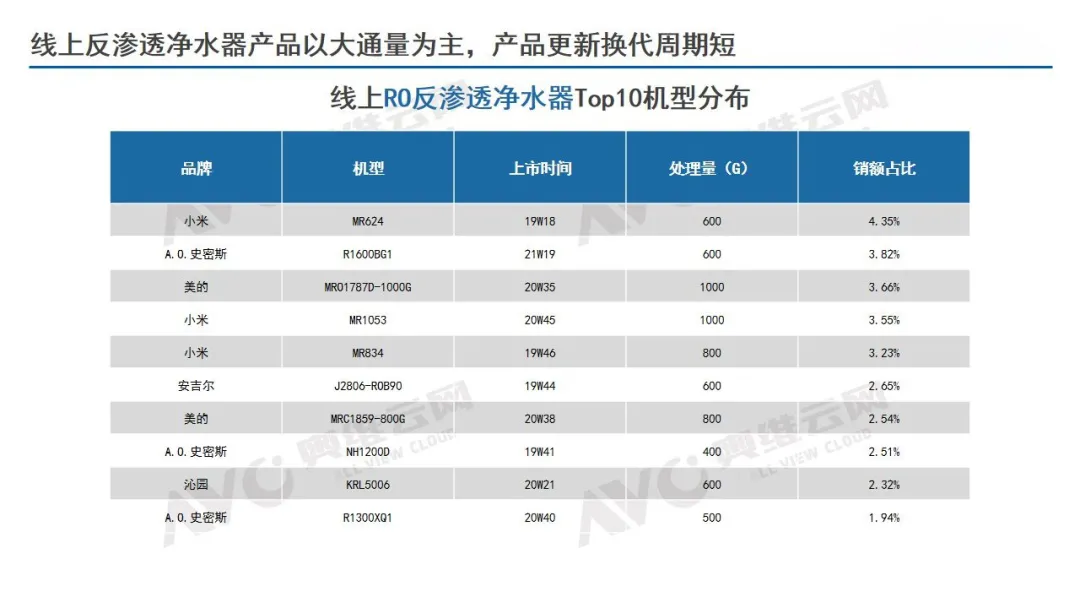 美的、a.o.史密斯、安吉尔、沁园等同样有几款产品上榜。线上反渗透净水器产品仍然以大通量为主,上线时间集中在19、20、21年,产品更新换代周期较短。