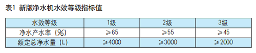 同时,反渗透净水机水效标准的水效等级分为5级,其中5级水效最低,且指标只有净水产水率;新版净水机水效标准的水效等级分为3级,且包括净水产水率和额定总净水量两个指标(详见表1)。