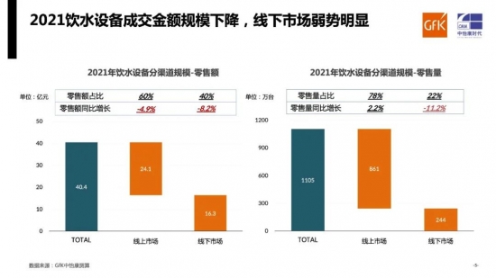 从成交金额来看,2021年家用饮水设备线上线下渠道零售额为24.1亿元和16.3亿元,分别同比下降了4.9%和8.2%;线上线下渠道零售量为861万台和244万台,线上渠道同比增长了2.2%,线下渠道同比下降了11.2%。其中,线下市场弱势明显,全年量额占比分别仅有22%和40%。