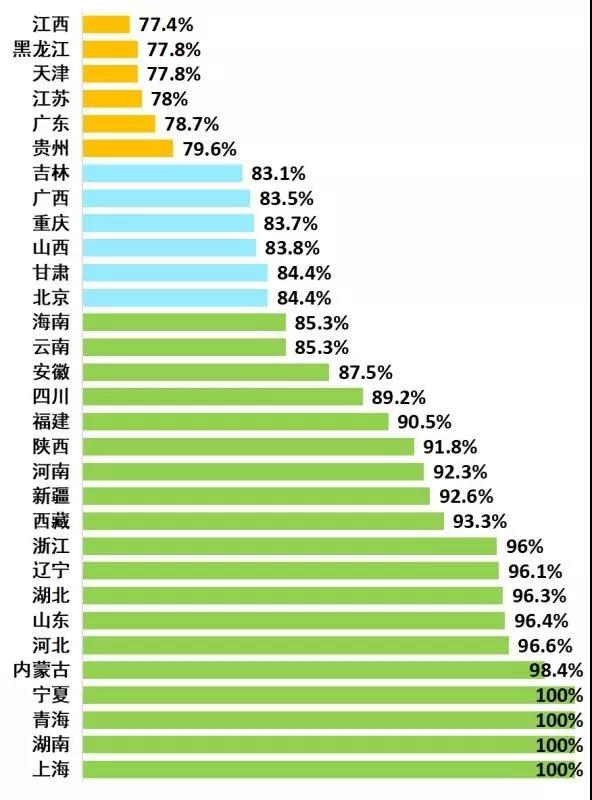 经综合评价:海南、西藏、浙江、青海、重庆、甘肃、新疆、上海、江西等9个省份考核等级为优秀;安徽、福建、广西、湖北、贵州、河南、湖南、云南、四川、河北、江苏等11个省份考核等级为良好;天津、北京、山东、广东、辽宁、内蒙古、宁夏、黑龙江、吉林、山西、陕西等11个省份考核等级为合格。